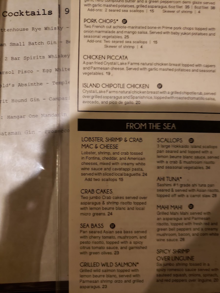Two french cut achiote-marinated bone-in prime pork chops topped with onion marmalade and mango salsa. Served with mashed potatoes and glazed carrots